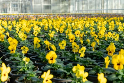 Unser Sortiment von Frühjahrsblühern besteht hauptsächlich aus Stiefmütterchen, Hornveilchen und Vergissmeinicht